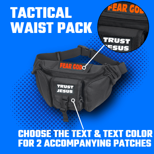Your PreachingGear tactical backpack will come with three black patches to mix and match on the front of your pack using the two hook and loop fields. Patch #1 and #2 are 3″x2″ and fit side-by-side in the upper hook and loop field of the backpack. Patch #3 is 3.25″x1.5″ and fits on the lower hook and loop field on the front of the backpack. Use the drop-down menu selections to choose your text and the color of your text. Once you’ve made your selections, add to cart and continue shopping or proceed to checkout.